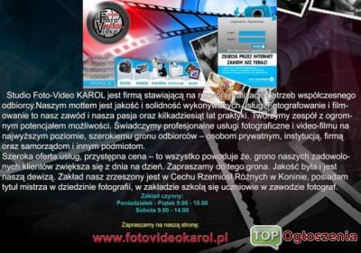 Foto-Video Karol świadczy usługi z różnych uroczystości oraz dla firm i instytucji.Wykonujemy zdjęcia ślubu,komunii,chrztu,reklamowe,do dok.Itp.Usługi ksero oraz Videofilmowania.Ponad 40 lat doświadczenia.Zakład czynny9-18 sobota9-14.ul.Chopina15(zatorze przy tuneluPKP) Zapraszamy fotovideokarol.pl/